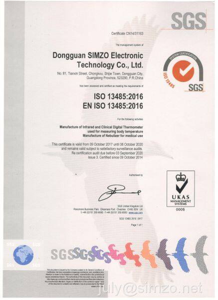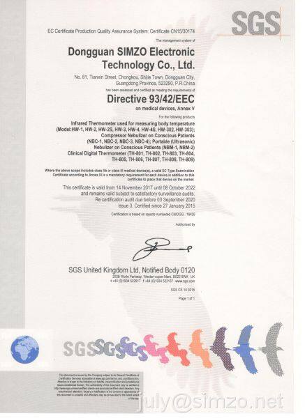 SIMZO is a professional manufacturer of infrared ear thermometer, digital thermometer, digital blood pressure monitor and nebulizer, etc. SIMZO Integrated solution development, product design, mass production with product marketing. In Dongguan, SIMZO covers an area of more than 5000 sqm as it’s production hub. It is equipped with modernized assembly lines, advanced testing facility and 300 plus well-trained staff. It’s most highlighted that SIMZO is backed by a top caliber team of designers and engineers who are with more than 10 years experience in the field of medical electronics. This team is always pioneering cutting-edge technology and transform technology innovation into practical utilization. Meanwhile, SIMZO is dedicated to quality control and cost performance. Plus, SIMZO is supported by numerous and reliable sub-suppliers due to it’s fine location in one of the key industrial regions of China. These advantages make SIMZO a distinctive and trusted brand both for OEM projects and customization service.To cater to a universal clientele, international quality requirements such as CE, FDA, MDD standards, as well as quality system ISO13485 have been met and attained. Over years, SIMZO already established long-term and strategic cooperation with CHICCO, AND, MOTHERCARE, BOOTS, CITIZEN, etc. We will continue, as ever, to develop and innovate to meet the market demand. We are looking forward to cooperating with you.